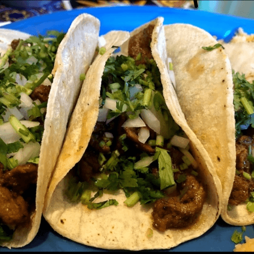 Mexican style - on corn tortillas with onion, cilantro and lime. American style - on soft flour or hard shell with lettuce, tomato, cheese and sour cream. Served with rice and beans. Choose chicken, steak or veggie - only one per order please