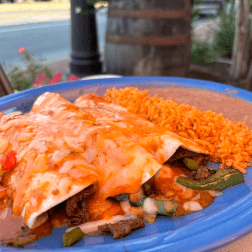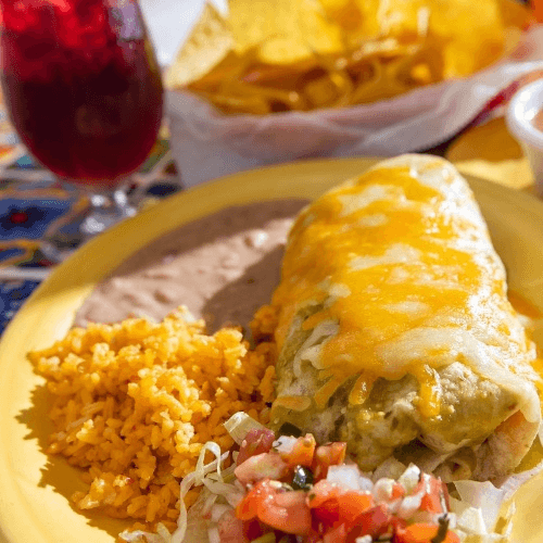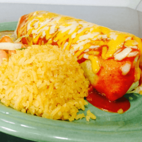 Meat, cheese, pico de gallo, sour cream and beans rolled in a large flour tortilla topped with sauce and melted cheddar-jack cheese. Served with rice and beans