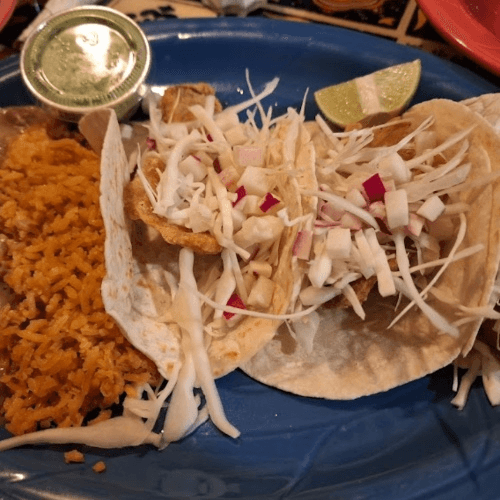 Fried or Grilled Tilapia Fillet topped with fresh shredded cabbage and radish on flour tortillas with a side of cilantro sauce. Served with Rice and Beans.