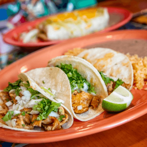 Three Flour tortillas stuffed with grilled chicken, topped with homemade Oaxacan-style mole sauce and cheese. Served with rice and beans.