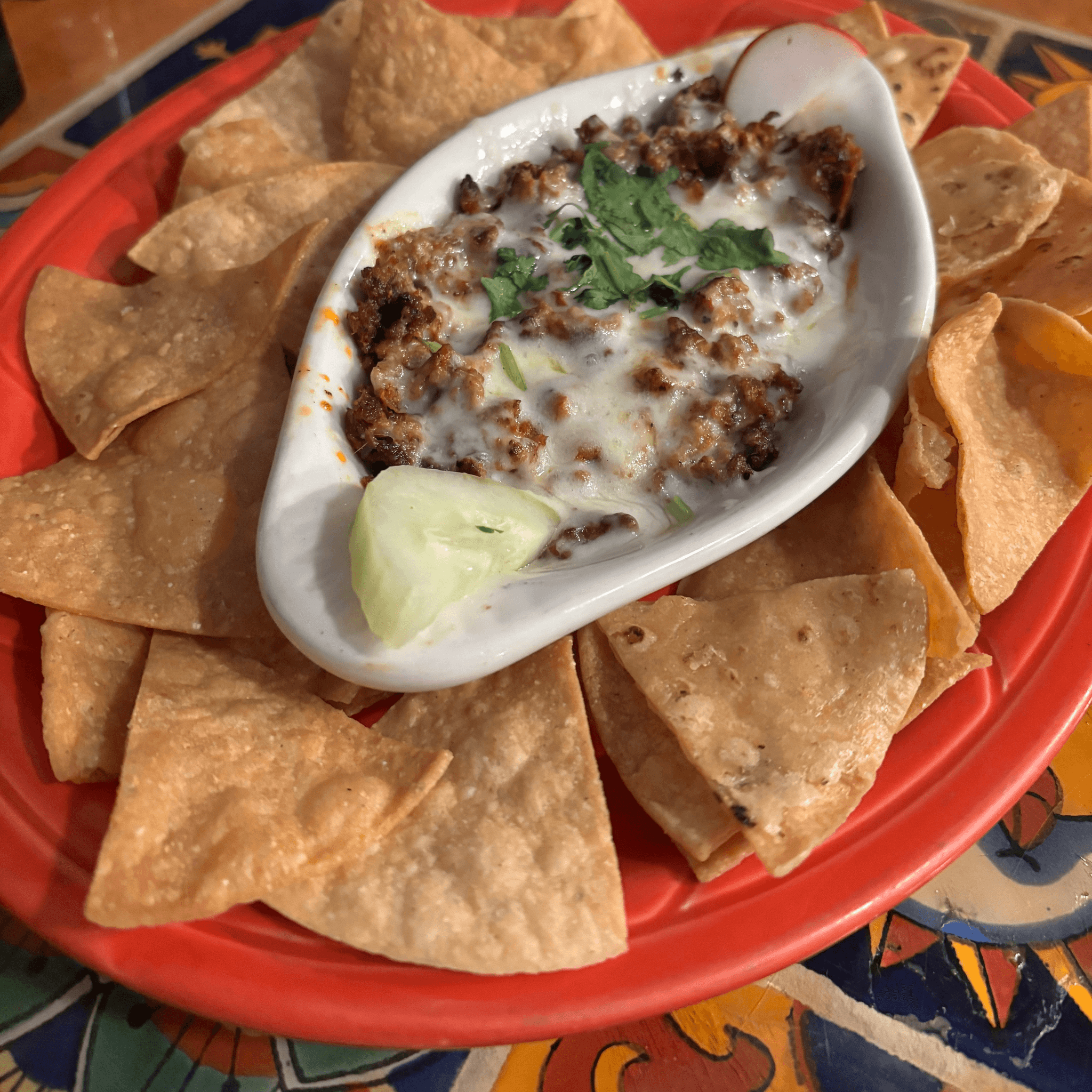 Crumbled chorizo sausage with melted queso Monterrey. Served with chips.
