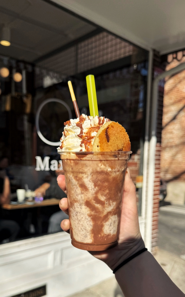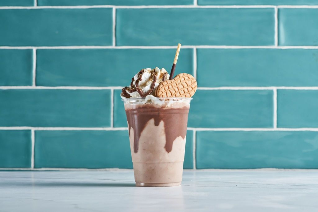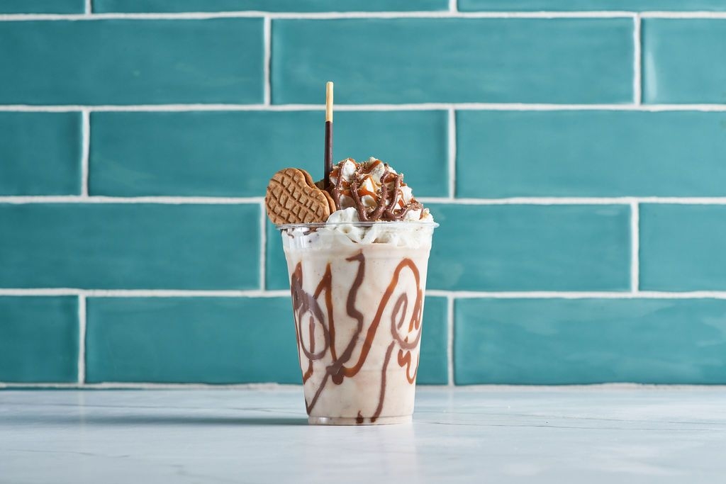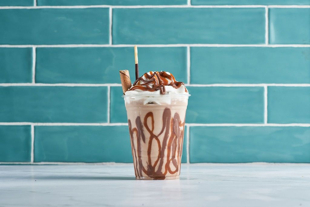 Caramel & chocolate sauce blended with coffee extract. Topped with caramel & chocolate drizzle, a coffee flavored wafer egg roll and chocolate pocky