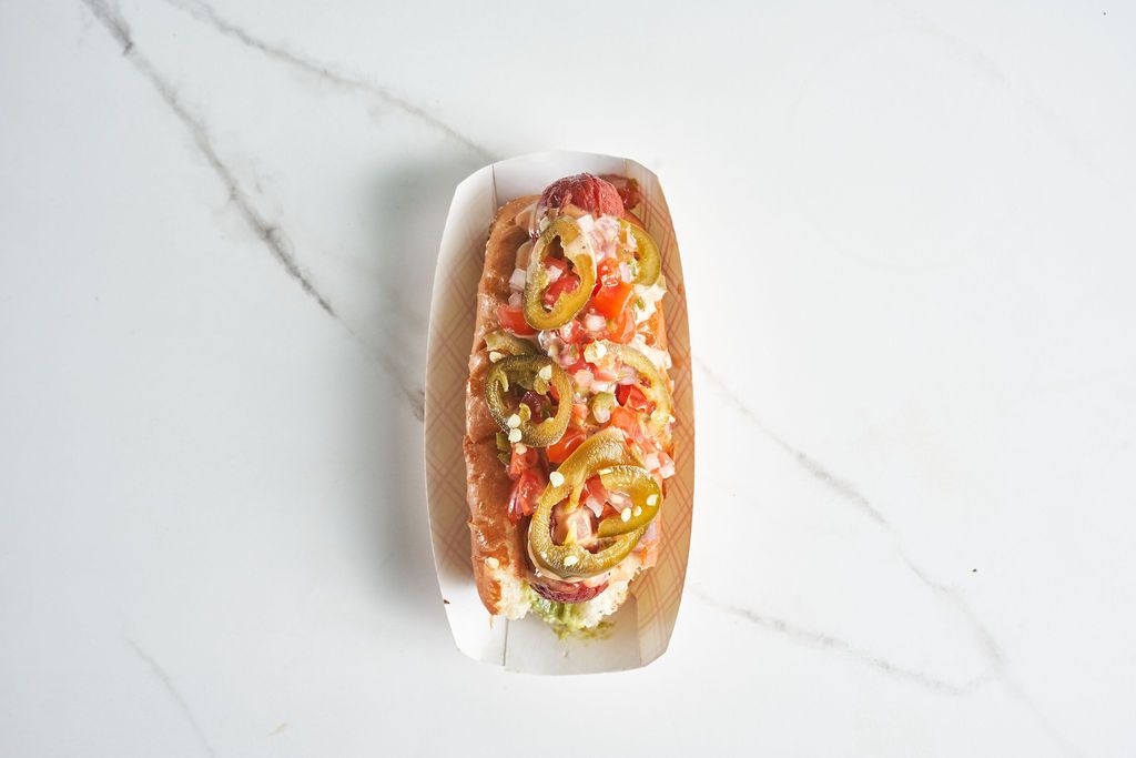 Beef & Pork Local Hot Dog / House-made Bun / Guacamole / Pico de Gallo / Salsa Rosada / Jalapeños