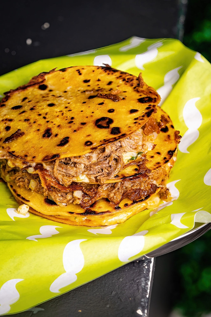 A crispy, golden-brown grilled cheese sandwich loaded with gooey melted cheese and your choice of meat—options include juicy steak, tender pulled pork, or savory birria. Perfectly toasted for the