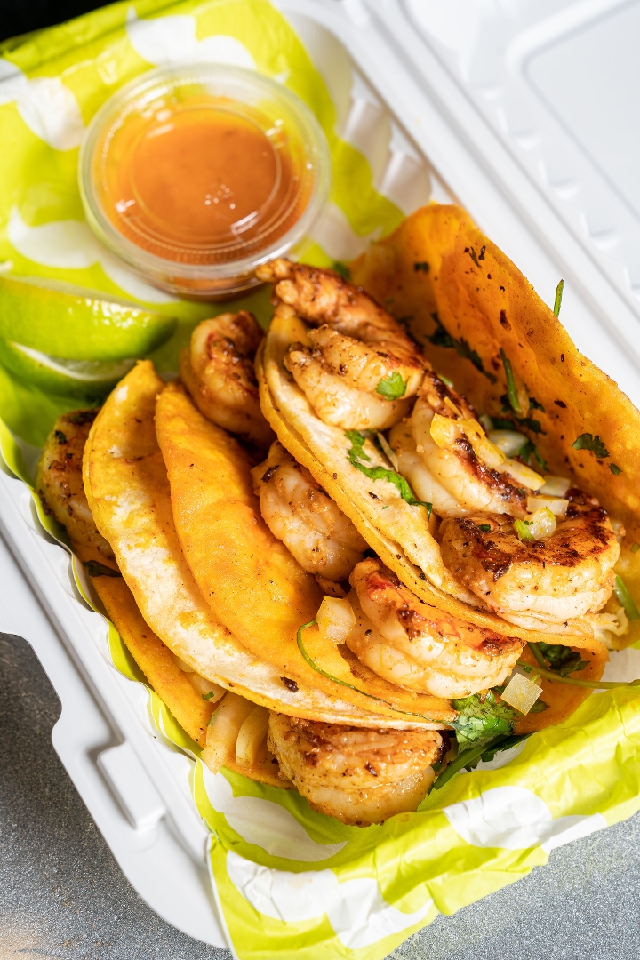 3x Seasoned Shrimp Tacos W/ Onions & Cilantro on Corn Tortillas.