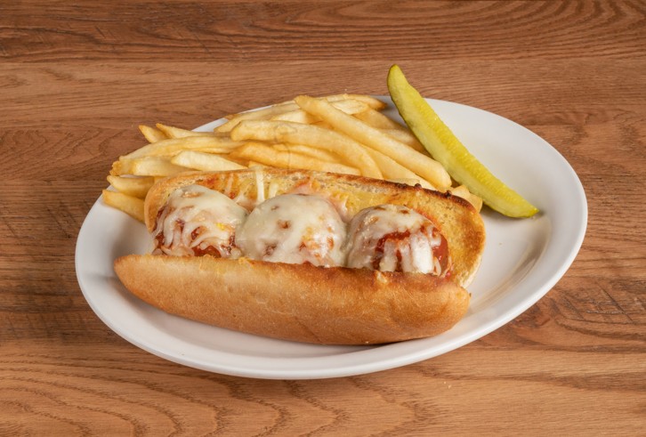 Perfectly seasoned meatballs covered with Anchor Bar pasta sauce and mozzarella cheese served on a baked hoagie roll.