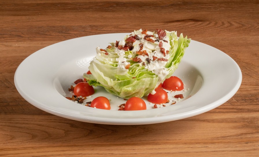 Iceberg wedge served with cucumbers, tomatoes, bacon and crumbled bleu cheese with bleu dressing.