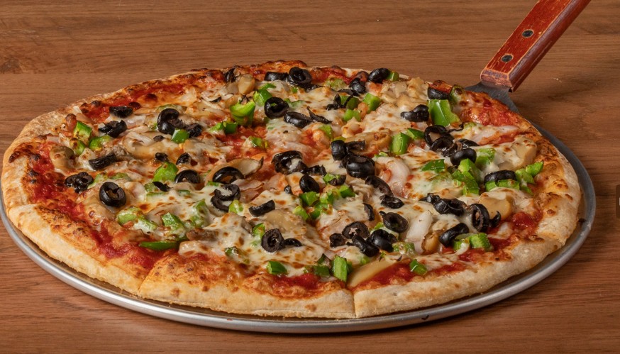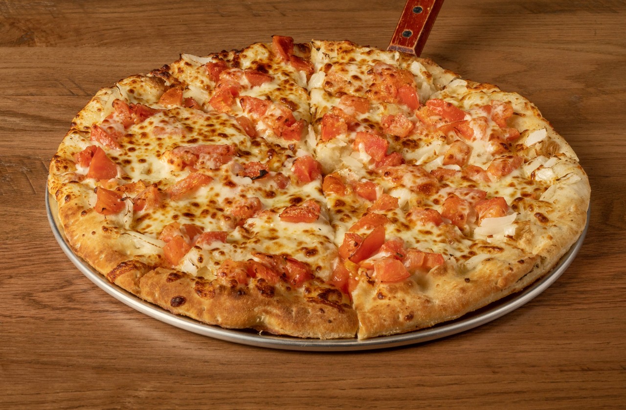 Our Anchor Bar pizza sauce and mozzarella cheese topped with mushrooms, green peppers, banana peppers and onion.