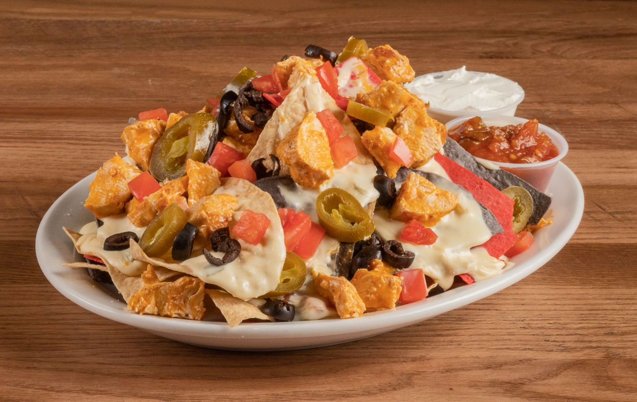 Multi-colored tortilla chips loaded with diced chicken, tomatoes, lettuce, black olives, pickled jalapenos and coated in Anchor Bar Original Medium Wing Sauce and queso. Served with sour cream and salsa.