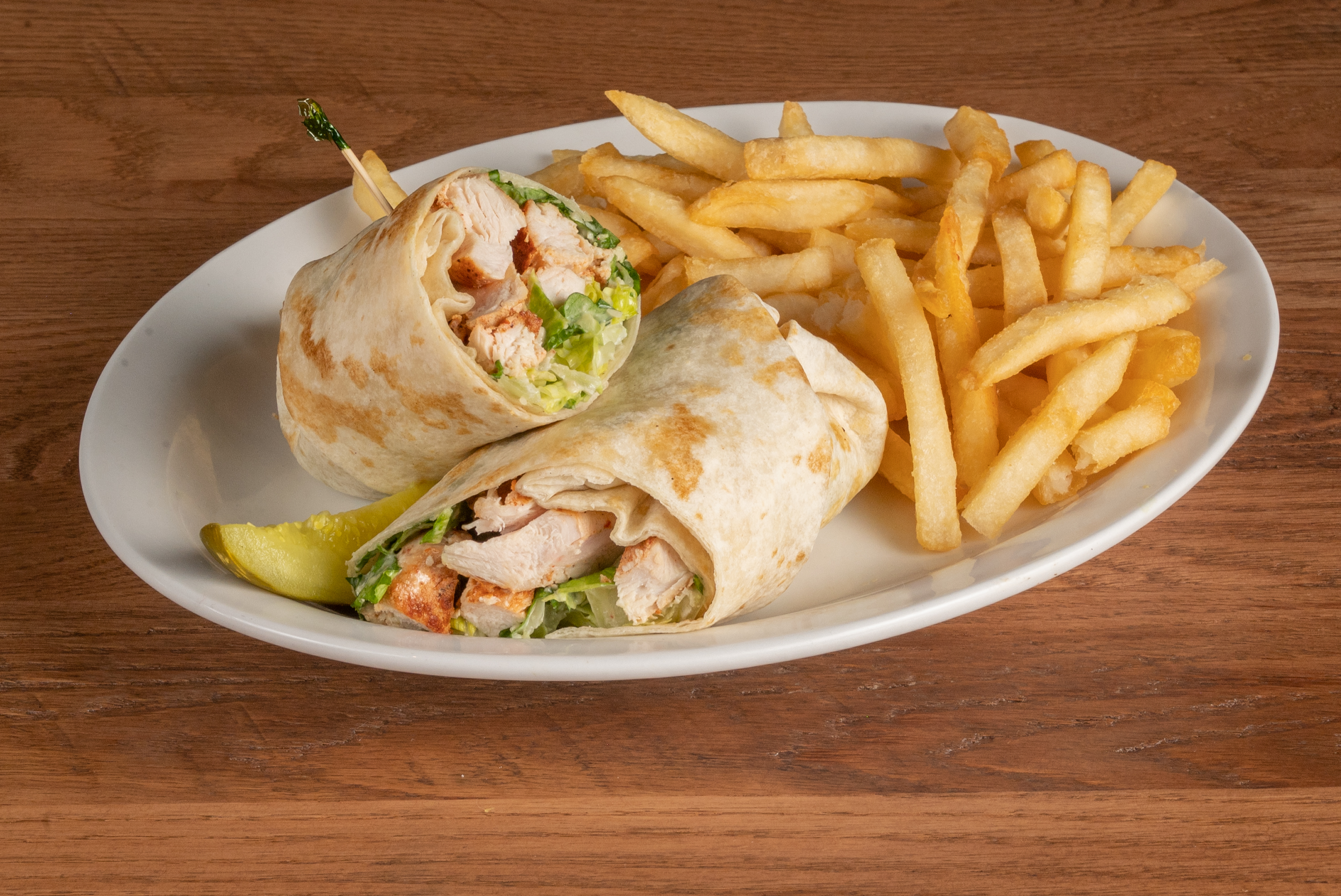 Tender grilled chicken strips with crisp romaine lettuce, parmesan cheese and creamy Caesar dressing wrapped in a flour tortilla.
