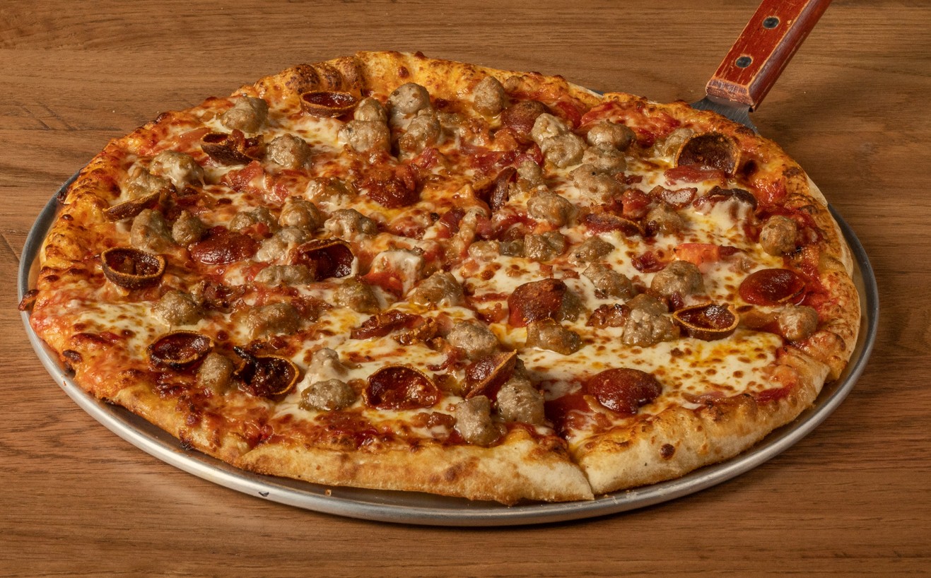 Sausage, bacon, pepperoni, mozzarella cheese and Anchor Bar pizza sauce.