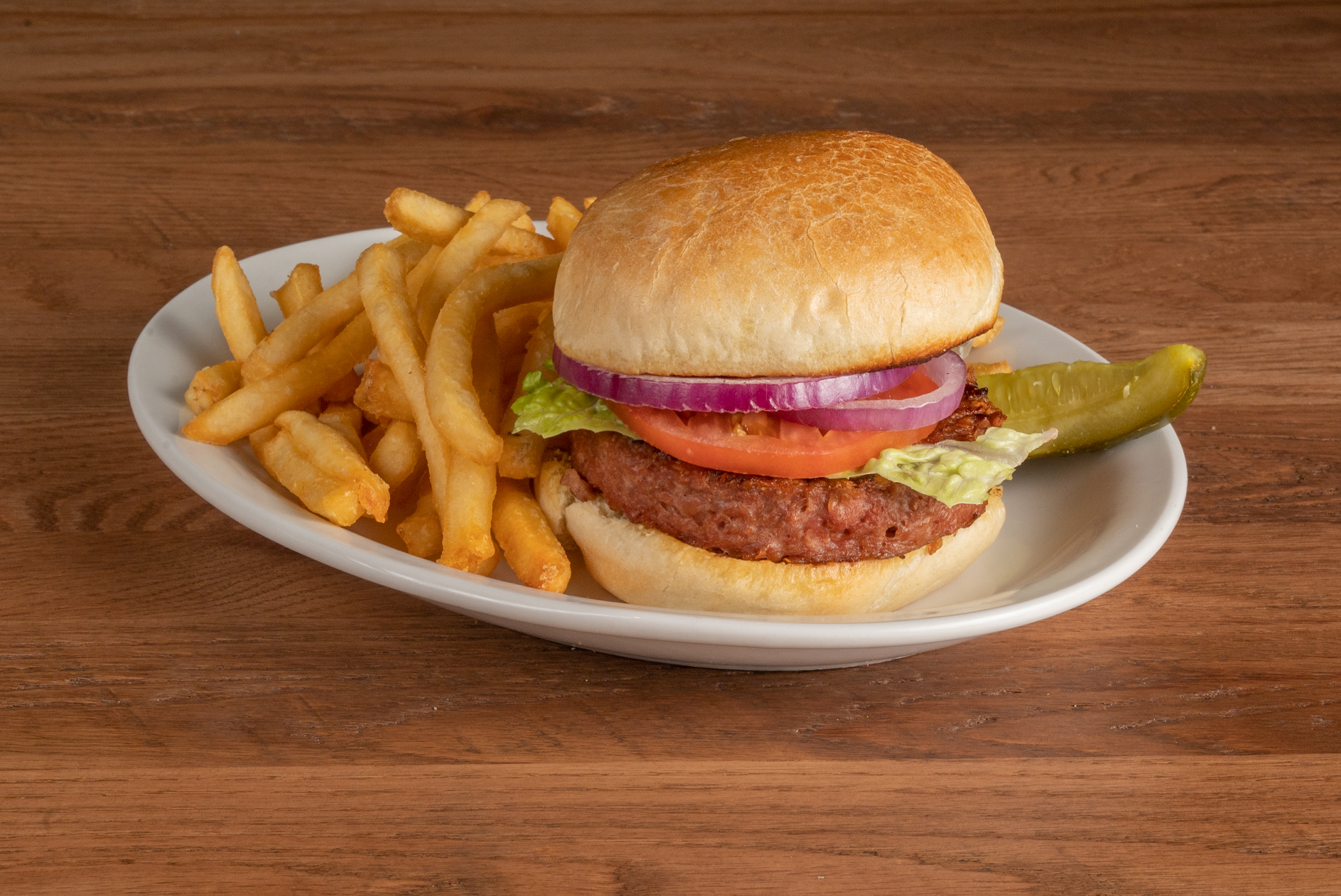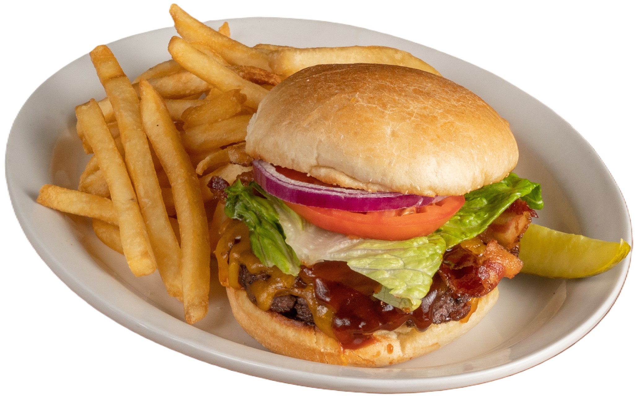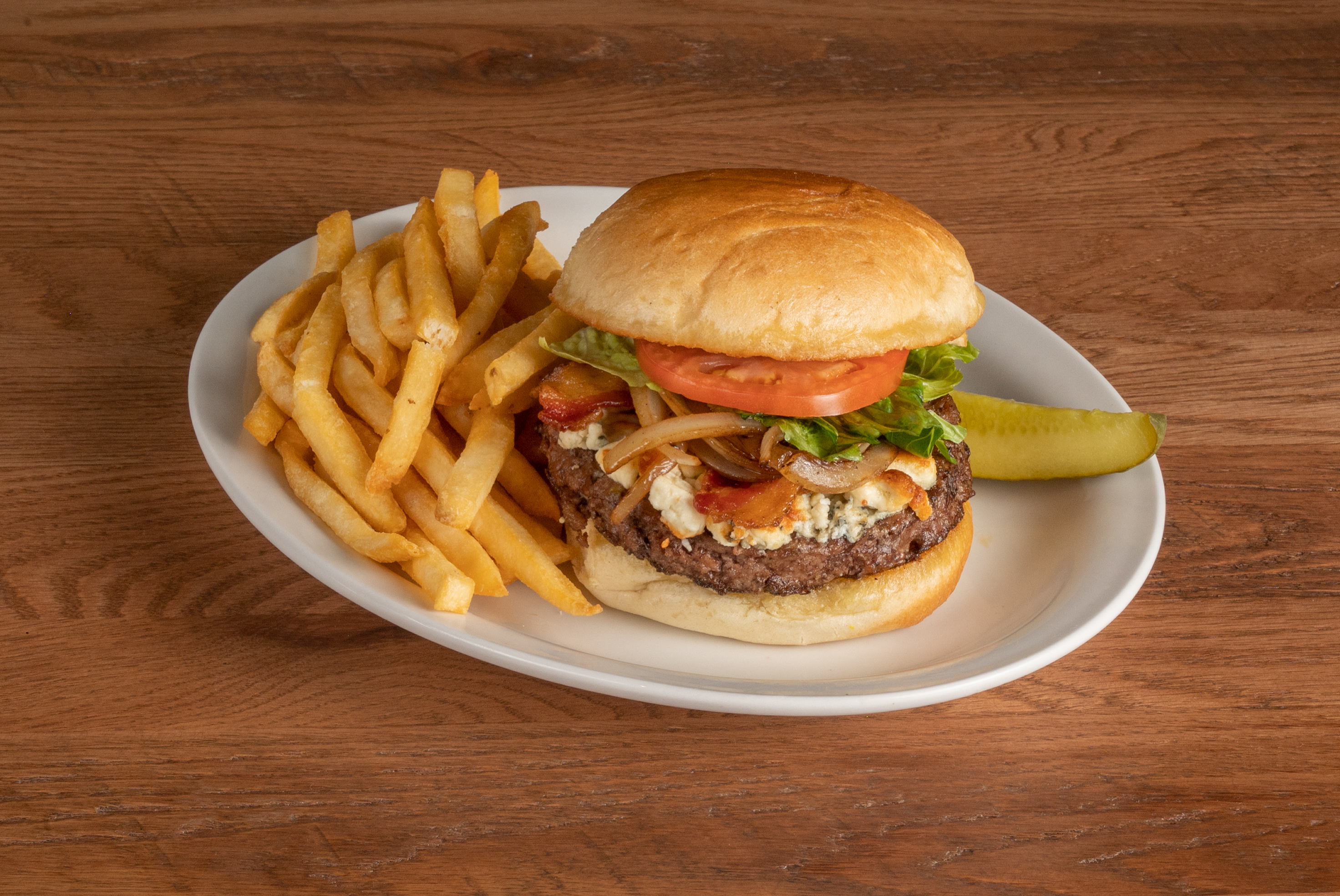 Our fresh Angus beef patty char-grilled and topped with caramelized onions, crispy bacon, crumbled bleu cheese, lettuce, tomato and red onion on a fresh kaiser roll.
