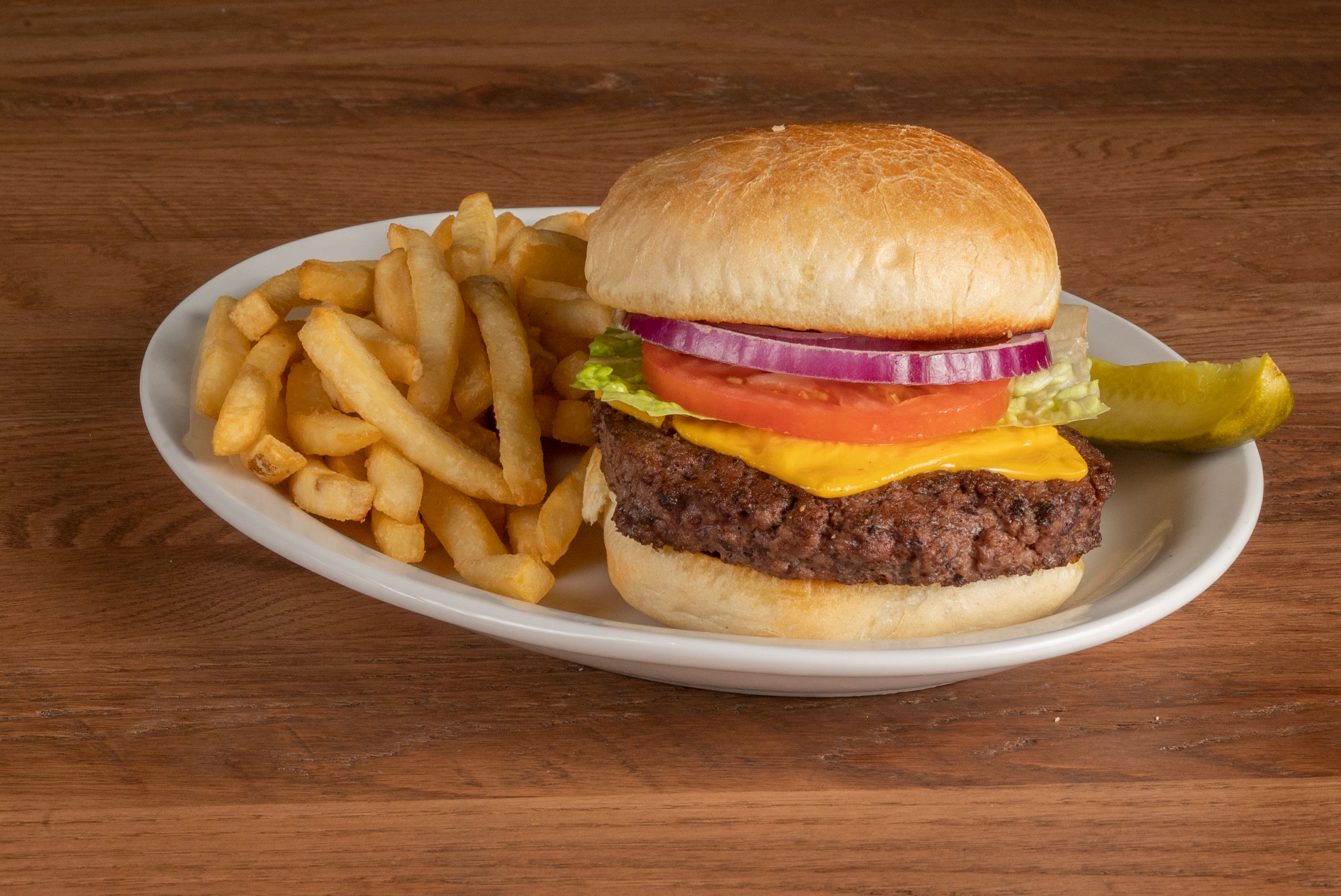 Our fresh Angus beef patty char-grilled and topped with American cheese, lettuce, tomato and red onion on a fresh kaiser roll.