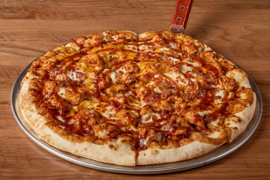 Chicken, mozzarella cheese, onions, bacon and BBQ sauce.
