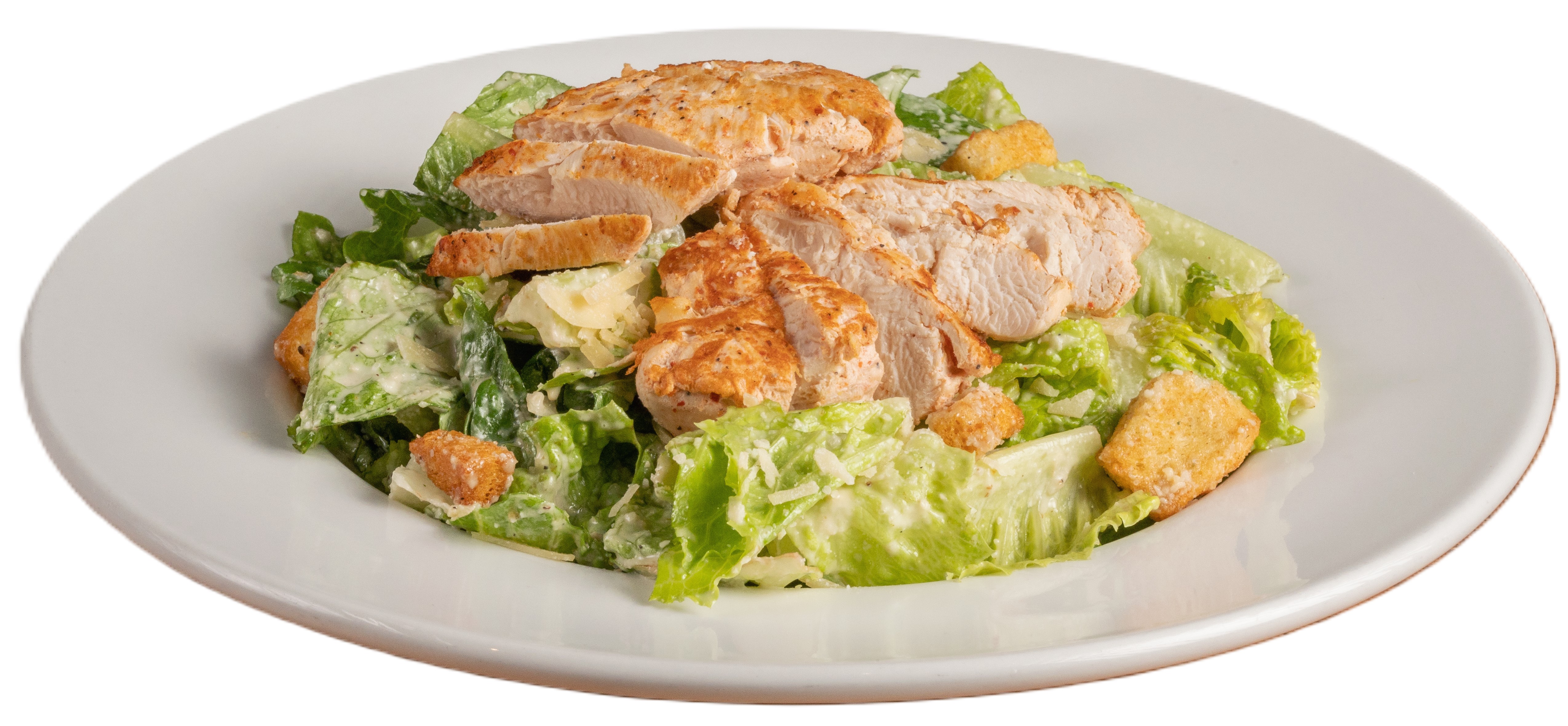 Fresh & crisp romaine lettuce topped with a grilled chicken breast, parmesan cheese and croutons.