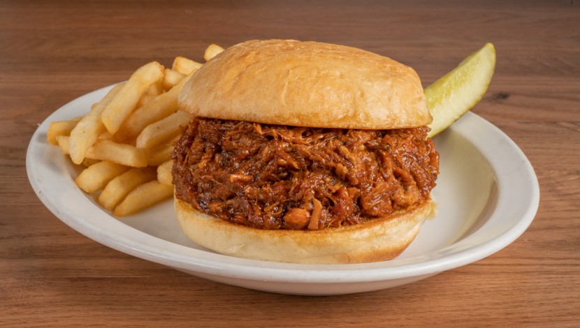Juicy bbq pork served on a fresh roll served with french fries.