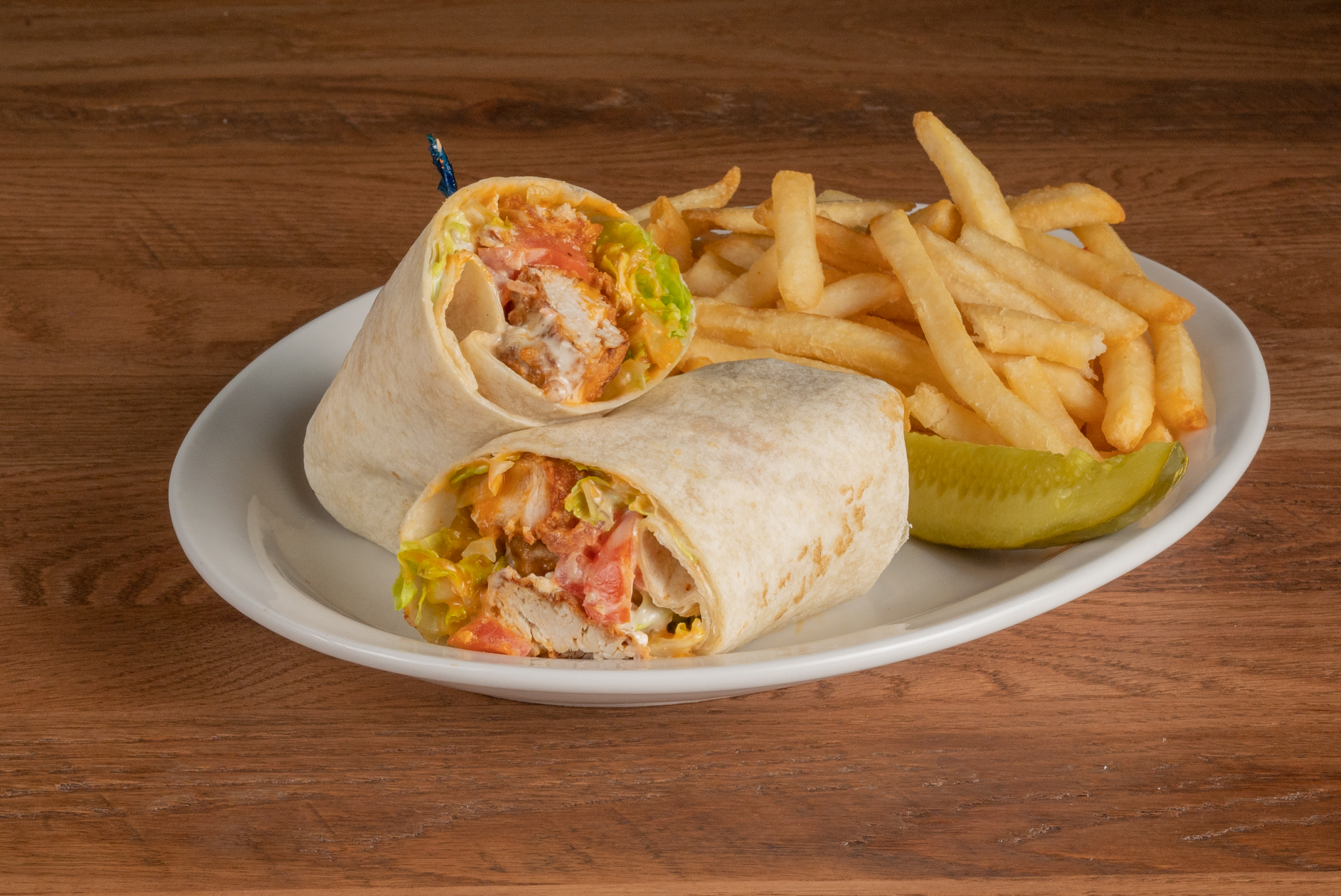Breaded chicken strips with Anchor Bar’s Original Medium Wing Sauce, crumbled bleu cheese and lettuce wrapped in a flour tortilla.