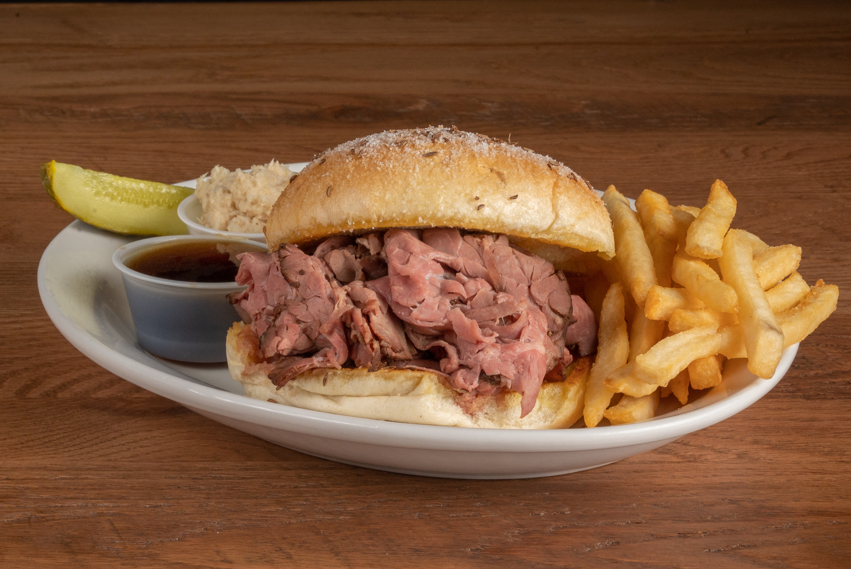 Slow-roasted, thinly sliced roast beef piled high and served on a freshly baked kimmelweck roll. With a side of au jus and horseradish.