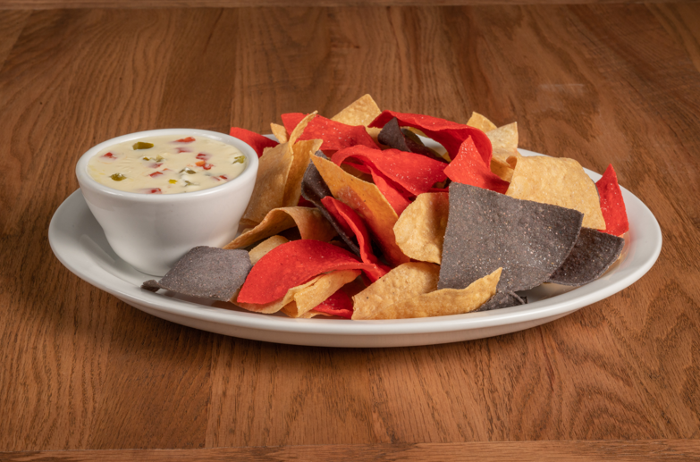 Mouthwatering queso served with multi-colored tortilla chips.