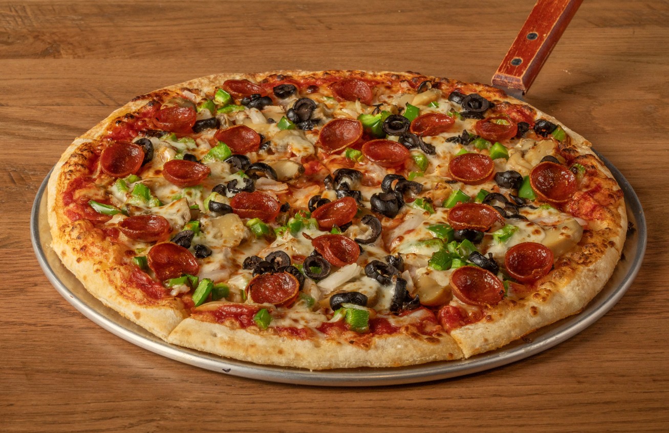 Anchor Bar pizza sauce, topped with cup n char pepperoni, sausage, mushrooms, green peppers, black olives and onions.