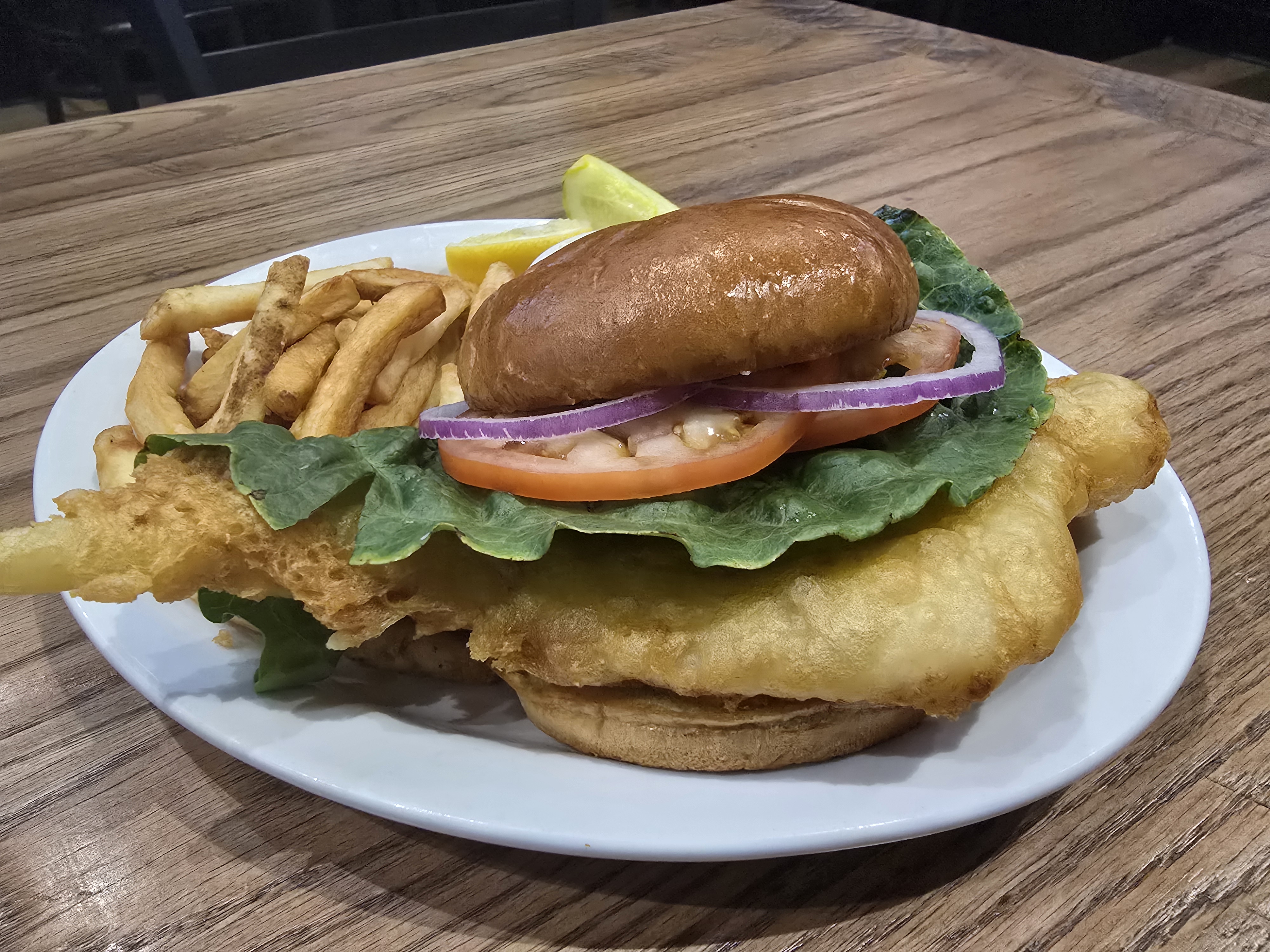 Hand battered haddock filet served on a kaiser roll with coleslaw and tartar sauce.