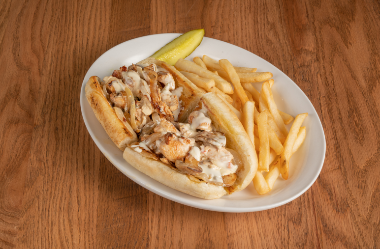 Tender chicken strips grilled with mushrooms and caramelized onions. Smothered in queso and served on a baked hoagie roll. Make it Buffalo-style with Anchor Bar’s Original Medium Wing Sauce!