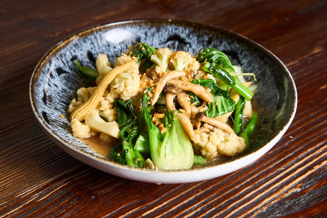 Beech mushroom, baby corn, bok choy, Chinese broccoli, cauliflower w/brown sauce
