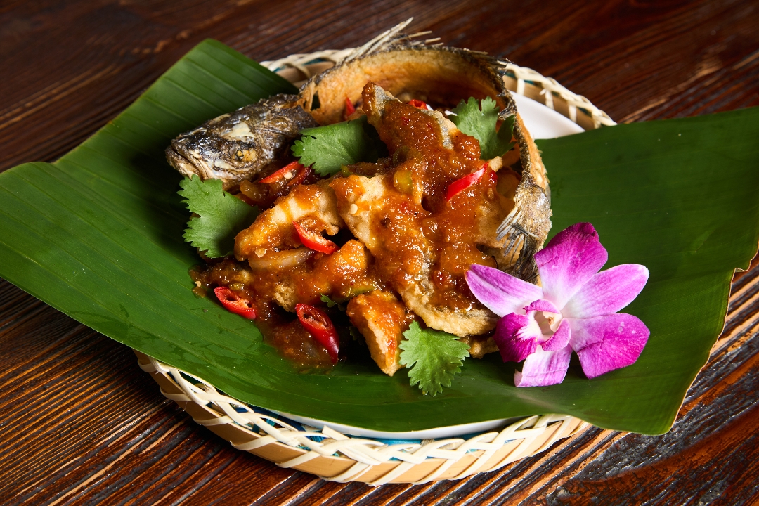 2/5 Spicy Level Fried fillet Bronzino sea bass, Cayenne pepper, onion w/sweet chili tamarind sauce