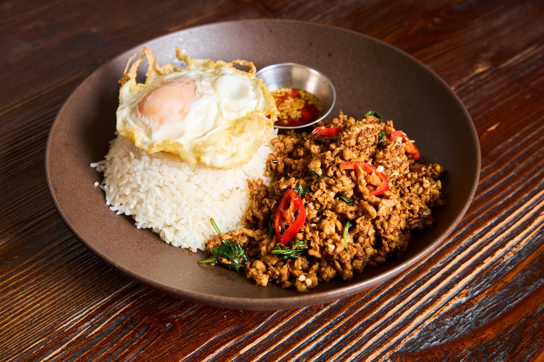 3/5 Spicy Level Traditional over rice dish w/ ground chicken, basil, fresh chili, over-easy fried egg*, Prik Num Pla (fish sauce and chili)